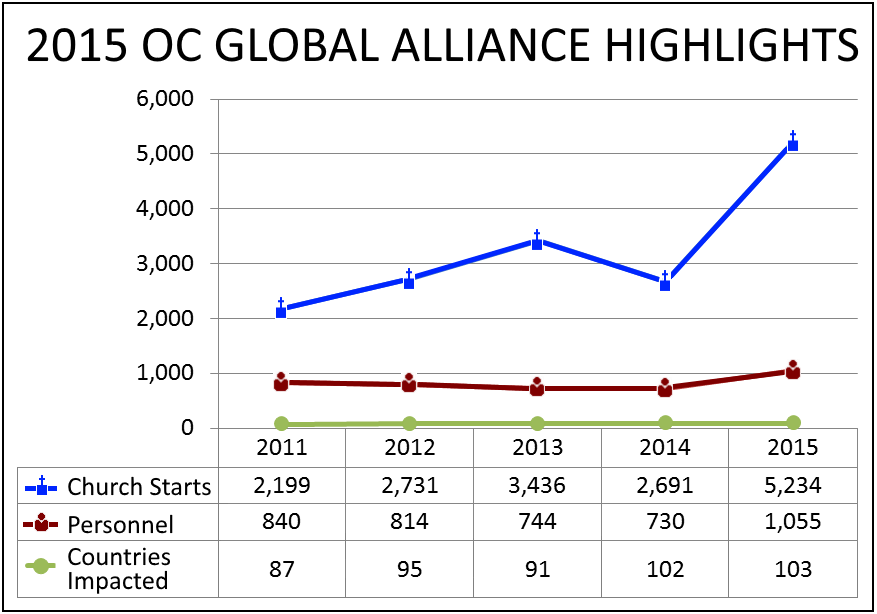 • With regard to ministry results, over 5,200 churches were started through the ministries of OC workers in 2015, almost double the number of churches started in 2014.